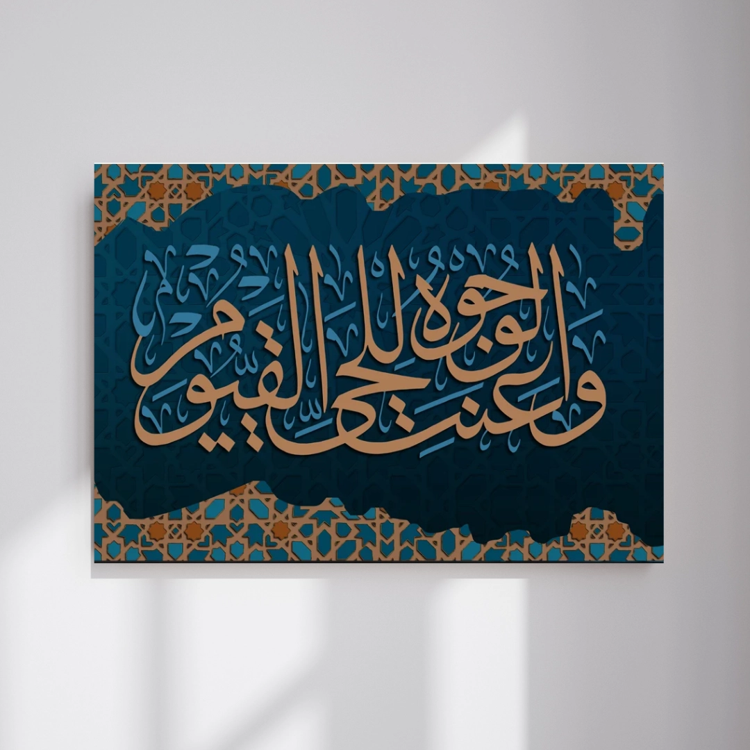 This captivating artwork features the Arabic calligraphy of "الوجوه لله وحده لا شريك له" (The faces are for Allah alone, with no partners), surrounded by intricate geometric patterns and rich blue and brown tones. The calligraphy is designed with elegant, flowing strokes, symbolizing devotion and the purity of faith. The detailed background complements the sacred message, invoking feelings of peace, reverence, and spiritual connection.